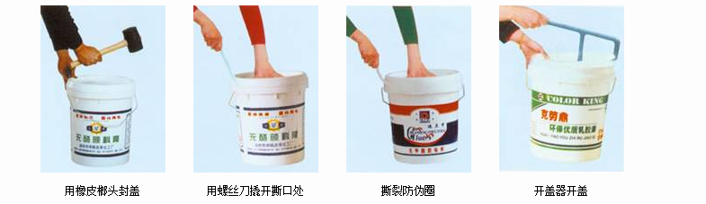 (4) 用右脚踩在桶盖中心,两手紧抓防伪圈撕裂处,沿桶四周向上拉,巨到完全打开。